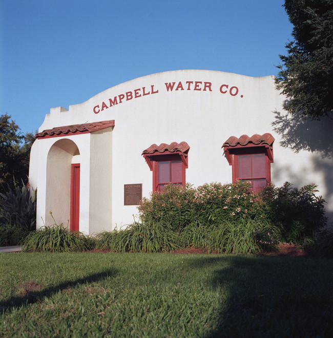 Nice old water_company building on a corner of Campbell Avenue, standing below  the water tower