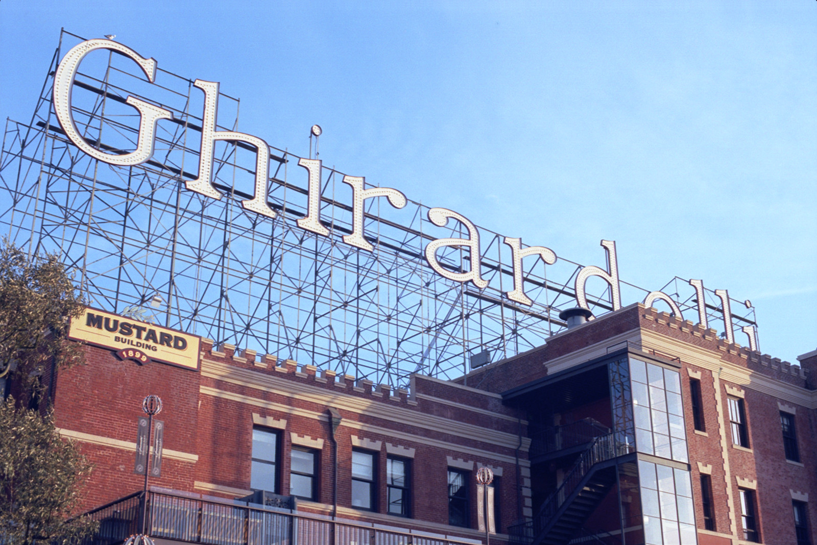 The huge sign, composed of more lightbulbs than you can count, stretches the full length of the Mustard and Cocoa Buildings in Ghirardelli Square. The camera was pointed up from the main plaza of Ghirardelli, near the Chocolate Shop.